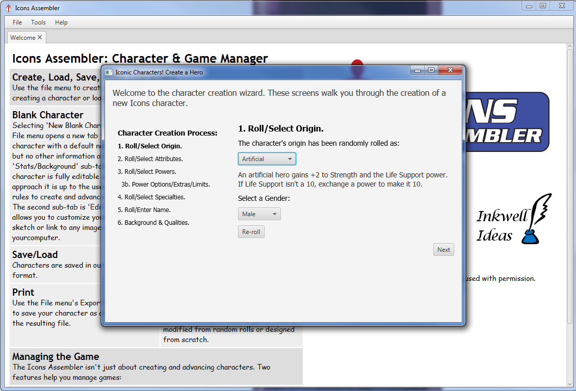 - In the spirit of Icons, you can make an almost completely random character. It will walk you through the process, step by step: origin, attributes, powers, specialties, etc.
