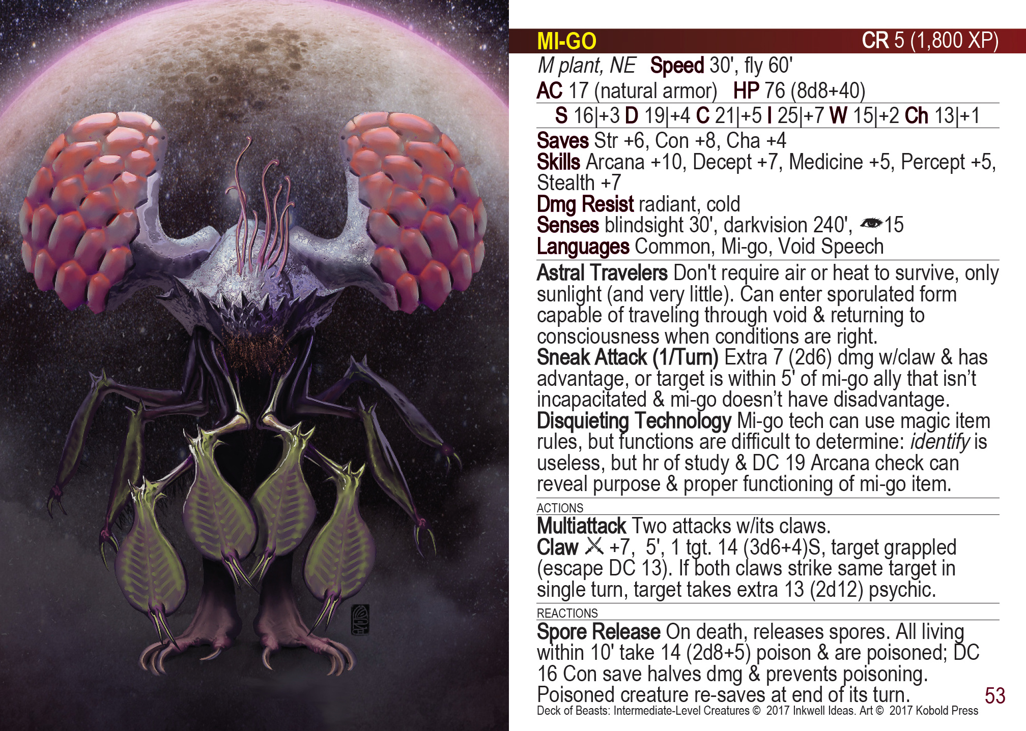 Inkwell Ideas has worked again with Kobold Press to create a second deck of monster cards based on Kobold Press’s very popular Tome of Beasts. This second deck covers creatures with challenge ratings from 3 to 5–nearly 100 monsters in all! The deck contains many favorites such as the Amphiptere, Flab Giant, Oculo Swarm, and Sarcophagus Slime. Some related creatures of other challenge ratings are also included such as all the Tome of Beasts’ Deep Ones and Tosculi.