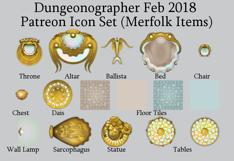 As we posted a few days ago, we’re relaunching our Patreon (something like a monthly subscription) for map icon mini-sets for use with our software programs. This time we’re trying to do themed months, and our first theme is Sea cultures, primarily merfolk. This post has the Dungeonographer map icons. These are perfect for use with battlemats. Each image is sized so that 300 pixels = 1″ printed = 5′ in real life.