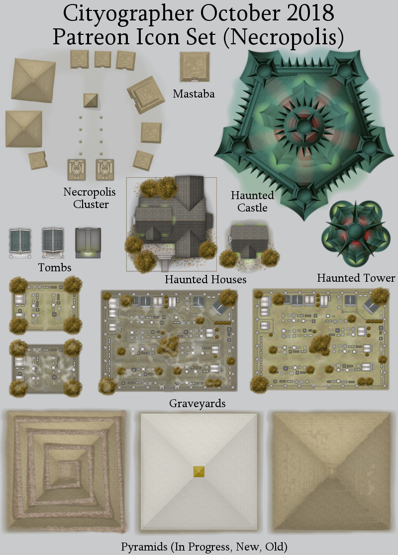 This is our final preview for October’s Patreon icons. If you’re not familiar with Patreon, it is something like an opt-in monthly subscription. This month’s theme is Necropolis, which we expanded a bit to graveyards, tombs, haunted places, pyramids, and more. This post has the Cityographer map icons by artist/cartographer Keith Curtis.