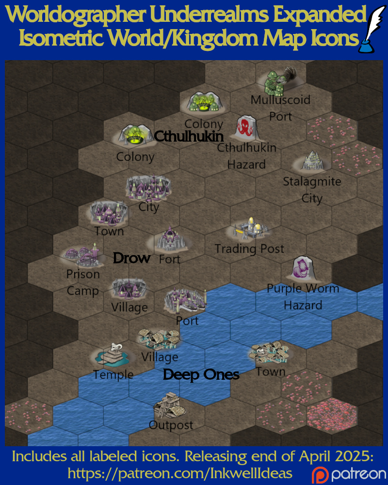Each month we create a set of 100+ map icons through our Patreon based on a theme our supporters select. This month’s winning theme was “Underrealms Expanded”. We’ve posted our first preview a day ago. Support us/get them via Patreon! (On the last day of the month we make a pinned post to get the icons via DriveThruRPG at no extra cost.)