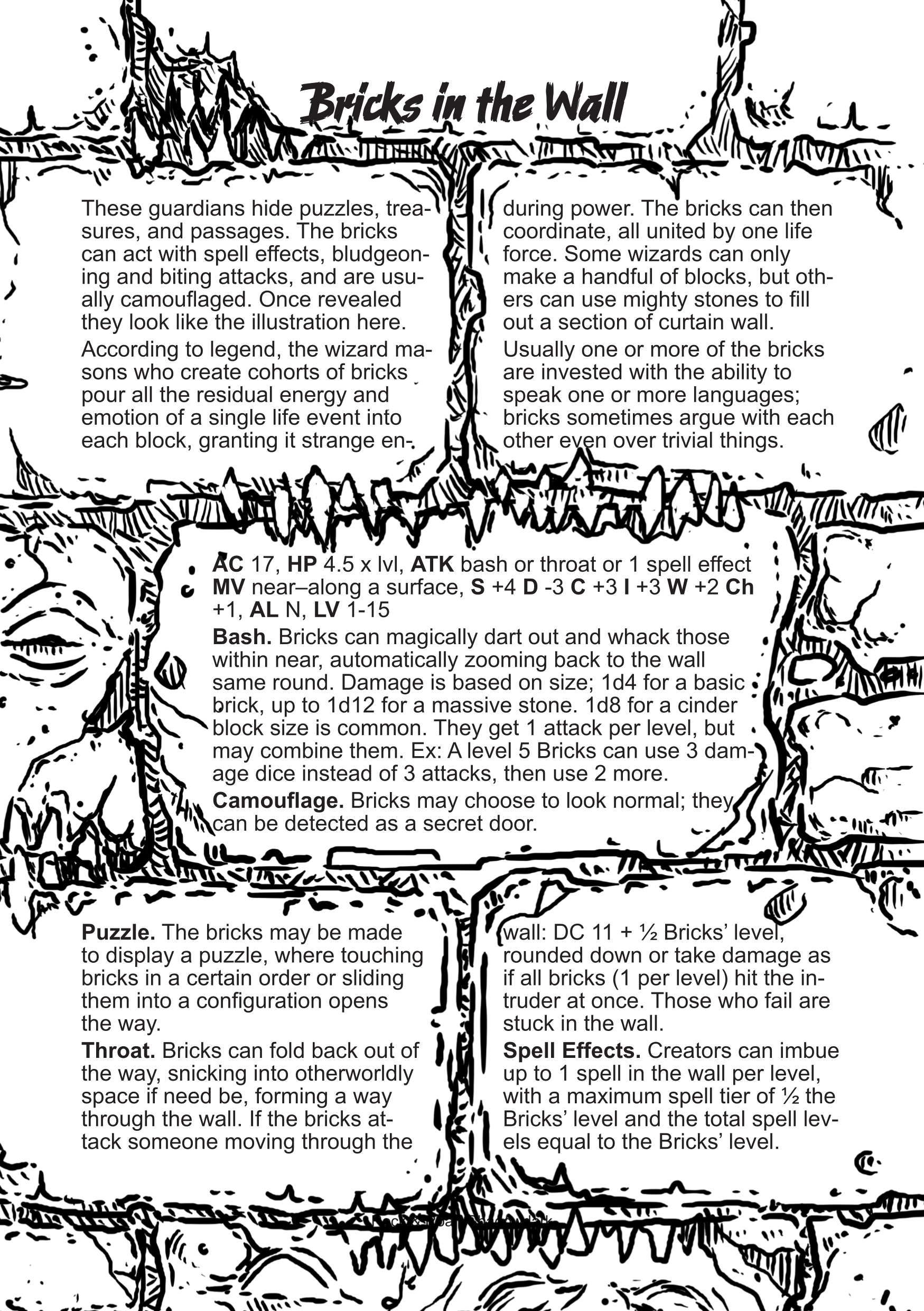 The book format/size is A5, about 1/2 a US Letter page–similar to the Shadowdark and OSE books. Each monster gets its own page with a short backstory/ecology, stats and abilities, and charts of alternate powers or idea generators (like ways to replace a character’s eye if the “Eyes Without A Face” sucked it out). And the layout of the book is more interesting than a standard 1/4 page image in the corner and 2 columns of text–but not too distracting. Our “Bricks in the Wall” has the bricks as the background with the mortar separating the text blocks on the bricks. Here is a sample Shadowdark creature followed by a sample OSE creature: