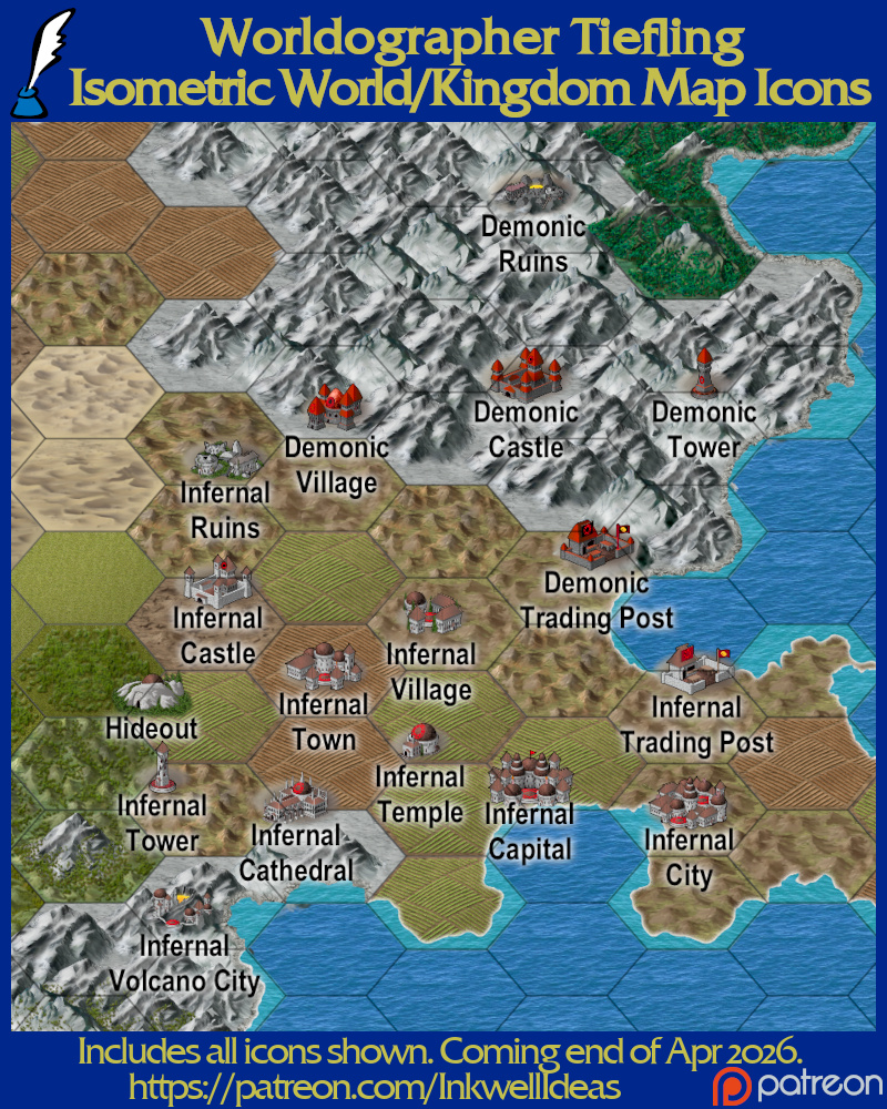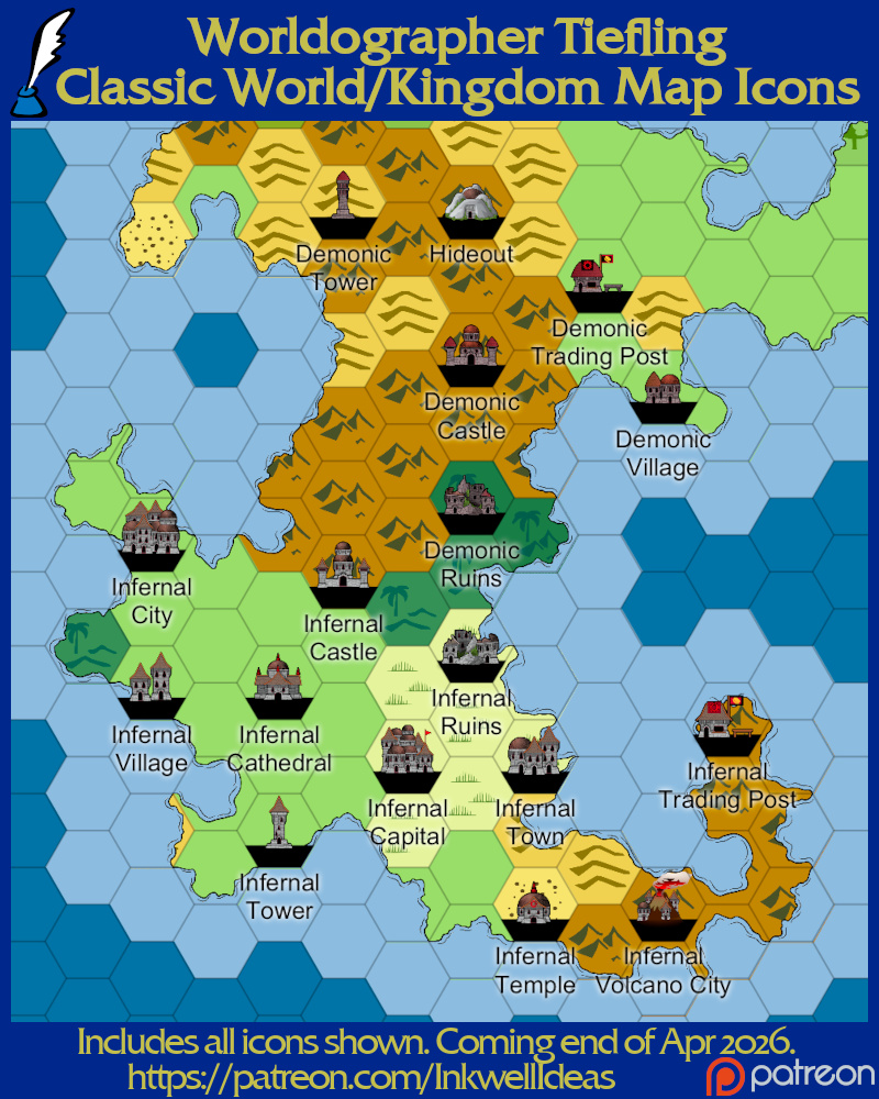 Each month we create a set of 100+ map icons through our Patreon based on a theme our supporters select. This month’s winning theme was “Tieflings”. Support us/get them via Patreon! (On the last day of the month we make a pinned post to get the icons via DriveThruRPG at no extra cost.)